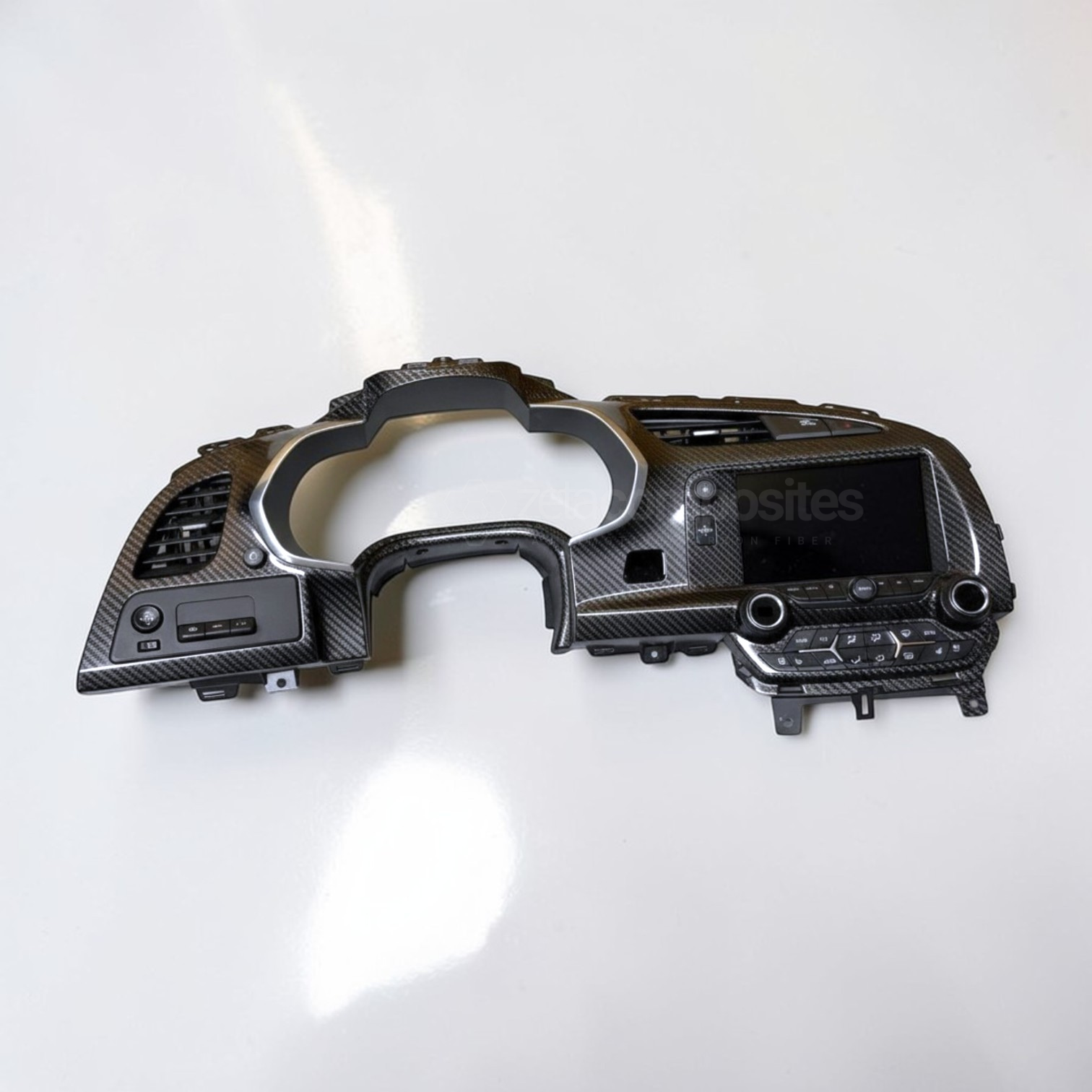 Direct replacement, real carbon fiber dash and gauge cluster for C7 Corvettes, 2014 and up, processed by our engineers at ZetaComposites Automotive Carbon Fiber.